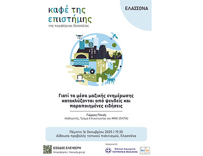 Η Περιφέρεια Θεσσαλίας, σε συνεργασία με τον εκπαιδευτικό μη κερδοσκοπικό οργανισμό «SciCo - Επιστήμη Επικοινωνία», εγκαινιάζει το «Καφέ της Επιστήμης της Περιφέρειας Θεσσαλίας», μια σειρά ανοιχτών εκδηλώσεων που φέρνουν την επιστήμη πιο κοντά στους πολίτες.