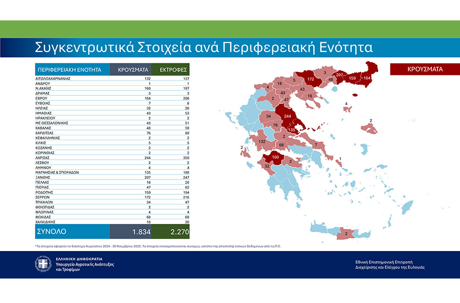 Για την τελευταία εβδομάδα αναφοράς (24–30 Νοεμβρίου 2025) καταγράφηκαν 80 νέα κρούσματα σε δεκαεπτά (17) Περιφερειακές Ενότητες, βάσει των αποτελεσμάτων των εργαστηριακών ελέγχων. Πρόκειται για τις Π.Ε. Αιτωλοακαρνανίας, Ν. Αχαΐας, Δράμας, Έβρου, Ηλείας, Ημαθίας, Μητροπολιτικής Ενότητας Θεσσαλονίκης, Καβάλας, Καρδίτσας, Λάρισας, Μαγνησίας &Σποράδων, Ξάνθης, Πέλλας, Πιερίας, Ροδόπης, Σερρών και Τρικάλων.