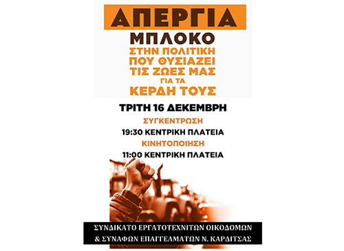 Όλοι στην Απεργιακή Κινητοποίηση των σωματείων στις 11:00 πμ στην κεντρική πλατεία και στο Παλλαϊκό Πανκαρδιτσιώτικο Απεργιακό συλλαλητήριο στην κεντρική πλατεία την Τρίτη 16/12 στις 19:30
