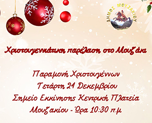 Ο Δήμος Μουζακίου σας προσκαλεί στη Χριστουγεννιάτικη Παρέλαση που θα πραγματοποιηθεί την Παραμονή Χριστουγέννων, Τετάρτη 24 Δεκεμβρίου, με ώρα έναρξης 10:30 π.μ.