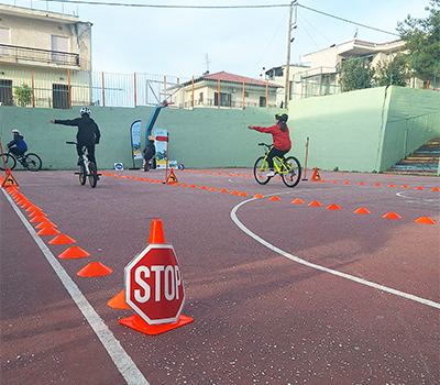Στη συνέχεια οι μαθητές της Ε' και Στ' με την υπεύθυνη υλοποίησης του προγράμματος Καθηγήτρια Φυσικής Αγωγής Εύη Ευαγγέλου εξασκήθηκαν σε διάφορες δεξιότητες στο προαύλιο του σχολείου ανά τμήμα με τα ποδήλατα και τα κράνη τους, προκειμένου να μάθουν να κυκλοφορούν με ασφάλεια και προσοχή.