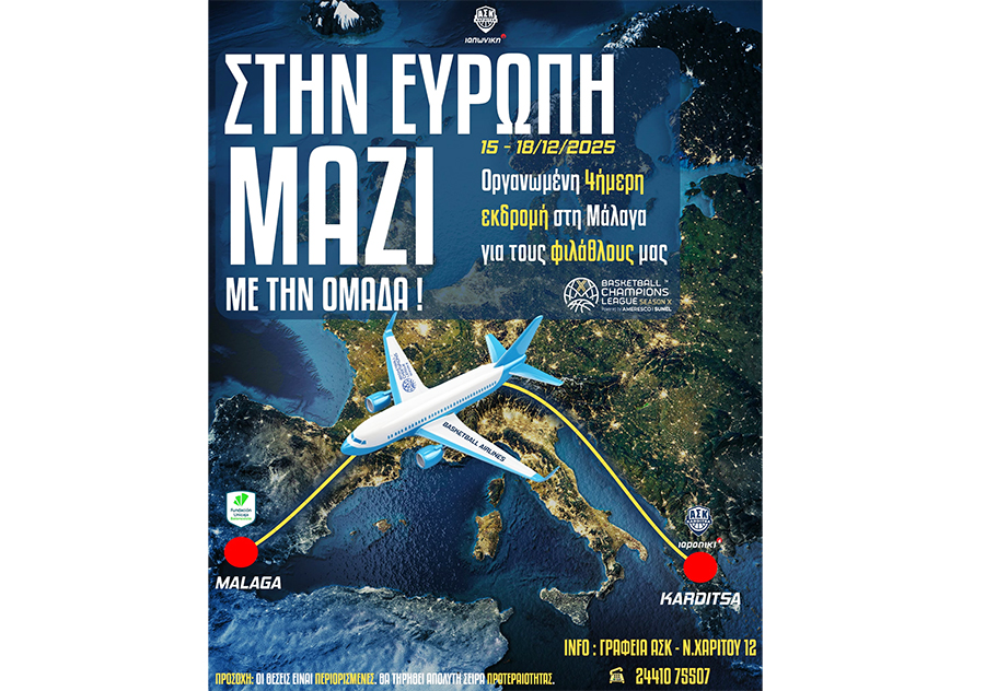 Ο Α.Σ.Καρδίτσας ΙΑΠΩΝΙΚΗ, δίνει τη δυνατότητα στους φιλάθλους ταξιδέψουν στην Μάλαγα για τον αγώνα του Basketball Champions League με την Unicaja Malaga στις 17 Δεκεμβρίου !!! Η τετραήμερη εκδρομή οργανώνεται με πρωτοβουλία του ΑΣΚ σε συνεργασία με το Caravel Travel και περιλαμβάνει τα αεροπορικά εισιτήρια, τις εσωτερικές μεταφορές και τη διαμονή από τη Δευτέρα 15 Νοεμβρίου έως την Πέμπτη 18 Νοεμβρίου στην πρωτεύουσα της Ανδαλουσίας.