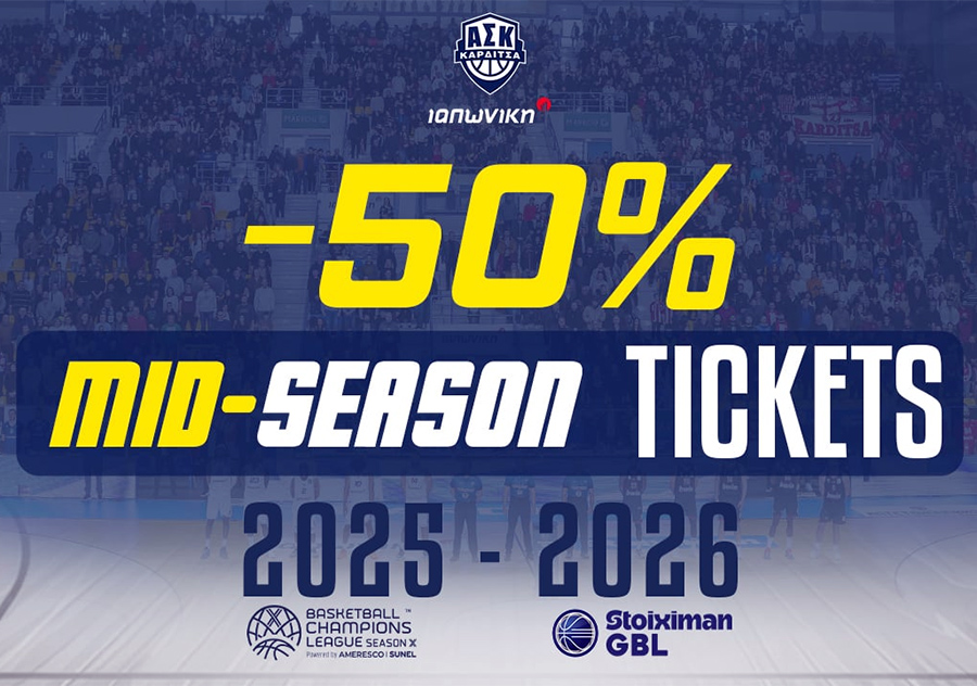 Ο Α.Σ.Καρδίτσας ΙΑΠΩΝΙΚΗ δίνει τη δυνατότητα σε όλους τους φιλάθλους να αποκτήσουν τώρα το εισιτήριο διαρκείας τους για τη σεζόν 2025-26 με έκπτωση 50%. Οι συναρπαστικοί αγώνες της Stoiximan GBL, αλλά και οι μεγάλες αναμετρήσεις για το Top16 του Basketball Champions League υπόσχονται αξέχαστες συγκινήσεις!!! Η ιστορική σεζόν για την ομάδα μας, συνεχίζεται με αμείωτο ενδιαφέρον σε Ελλάδα και Ευρώπη και στην πόλη μας, θα υποδεχθούμε τα μεγάλα αστέρια του ελληνικού και ευρωπαϊκού μπάσκετ.