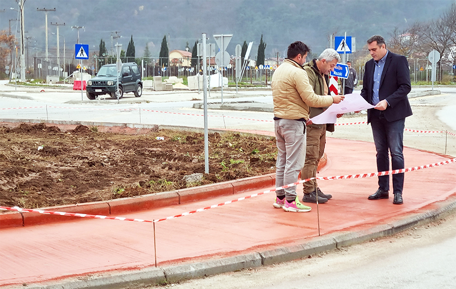 Σε ό,τι αφορά τον κυκλικό κόμβο, απομένουν εργασίες οδοποιίας, η ολοκλήρωση της κατασκευής των εναπομεινάντων πεζοδρομίων, η επίστρωσή τους με πλάκες, η τοποθέτηση των φωτιστικών σωμάτων και η τελική διαμόρφωση του χώρου.