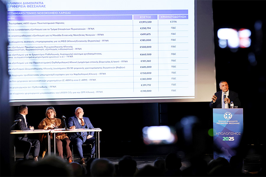Αναφερόμενος στα έργα που δρομολογούνται το 2026 αναφέρθηκε στα νέα κλειστά κολυμβητήρια (6 + 3), στα κλειστά γυμναστήρια, στο Γηροκομείο Λάρισας, στην νέα πτέρυγα του ΓΝΛ που ξεκίνησε.