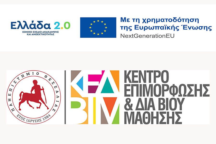 Το Κ.Ε.ΔΙ.ΒΙ.Μ. του Πανεπιστημίου Θεσσαλίας σε συνεργασία με Μέλη ΔΕΠ του Ιδρύματος σχεδιάζει και υλοποιεί προγράμματα κατάρτισης ανέργων δίνοντας σε όλους την ευκαιρία για πρόσβαση στην Ακαδημαϊκή Εκπαίδευση και Επιστημονική Κατάρτιση. Η δράση υλοποιείται στο πλαίσιο του Εθνικού Σχεδίου Ανάκαμψης και Ανθεκτικότητας «Ελλάδα 2.0» με τη χρηματοδότηση της Ευρωπαϊκής Ένωσης – Next Generation EU.