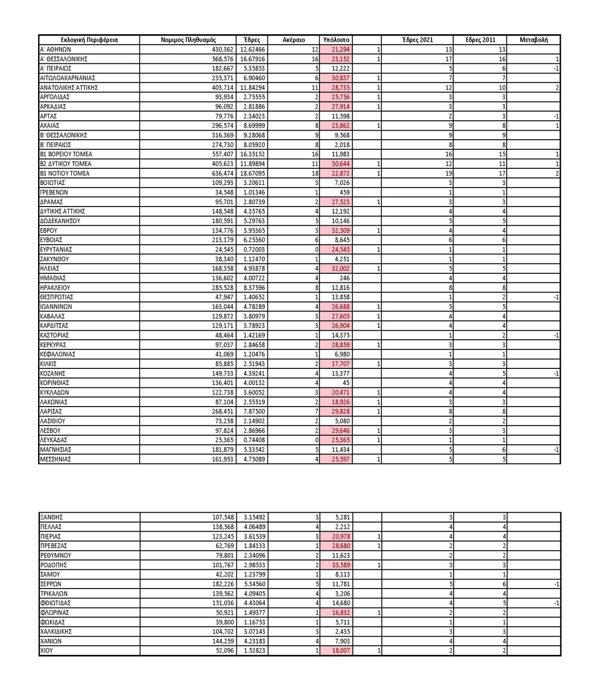 Αλλαγές, στην κατανομή των βουλευτικών εδρών στις εκλογικές περιφέρειες όλης της χώρας, φέρνουν τα αποτελέσματα της απογραφής του 2021, με βάση τα οποία θα γίνουν οι εθνικές εκλογές του 2023.