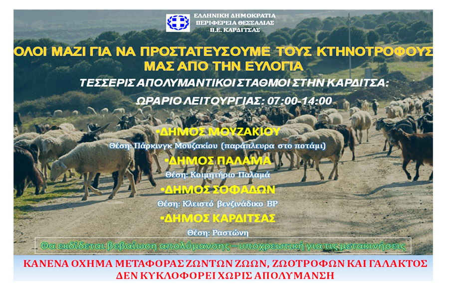 Το Γραφείο Αγροτικής Ανάπτυξης Δήμου Μουζακίου σε συνεργασία με τη Διεύθυνση Κτηνιατρικής και Υποδιεύθυνση Κτηνιατρικής Π.Ε. Καρδίτσας, ενημερώνουν ότι από τη Δευτέρα 22 Σεπτεμβρίου 2025 και με ωράριο 07:00-14:00 στην Π.Ε. Καρδίτσας θα λειτουργούν τέσσερις απολυμαντικοί σταθμοί. Όλα τα οχήματα μεταφοράς ζώντων ζώων (όλων των ειδών), γάλακτος και ζωοτροφών θα πρέπει να φροντίσουν να διέρχονται κατά τη μετακίνησή τους από τους σταθμούς.