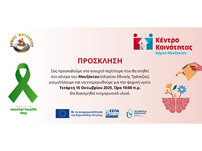 Το Κέντρο Κοινότητας Δήμου Μουζακίου και η αρμόδια Αντιδήμαρχος Κοινωνικής Πολιτικής και Εθελοντισμού κ.Μαριάννα Ζιάκα, σας προσκαλούν την Τρίτη 15 Οκτωβρίου στο περίπτερο που θα στηθεί στο κέντρο του Μουζακίου, πλησίον της Εθνικής Τράπεζας, για μια ανοιχτή συζήτηση και ενημέρωση σχετικά με την ψυχική υγεία.