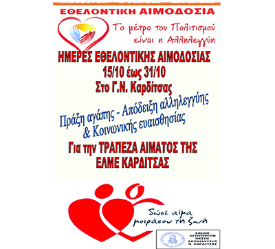 altΑπό 15/10 έως και 31/10, στο τμήμα Αιμοδοσίας του Γενικού Νοσοκομείου Καρδίτσας