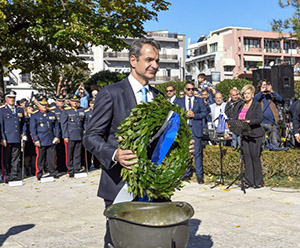 Νωρίτερα, ο Κυριάκος Μητσοτάκης παρέστη στην επίσημη δοξολογία στον Μητροπολιτικό Ναό και κατέθεσε στεφάνι, στο Μνημείο Μπιζανομάχων.
