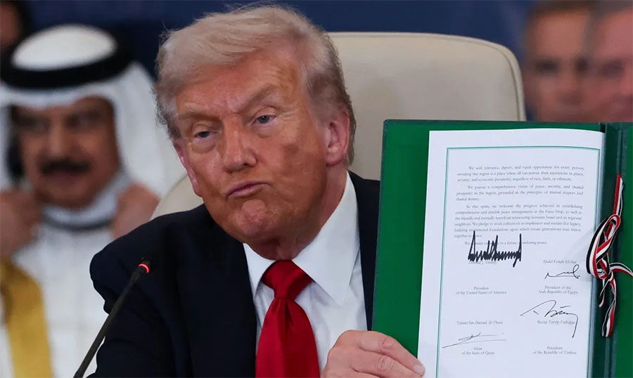 Στη Σύνοδο για τη Γάζα στο Σαρμ ελ Σέιχ της Αιγύπτου, ο Τραμπ υπέγραψε, μαζί με τους ηγέτες της Αιγύπτου, του Κατάρ και της Τουρκίας, τη διακήρυξη «Ειρήνη 2025», με στόχο την παγίωση της κατάπαυσης του πυρός και την έναρξη μιας νέας περιόδου σταθερότητας στη Γάζα.